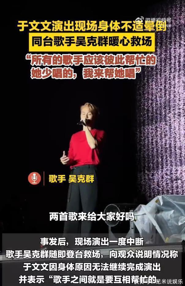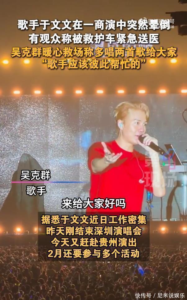这场意外早有预警。当晚演出因设备故障推分钟,于文文和观众一同在寒风中等待,登台后演唱《原罪》时,就出现频繁眨眼、手部颤抖的不适症状。但她始终强忍,坚持唱完四首歌,直到曲终转身蹲下后彻底失去意识,被工作人员用担架抬离,10分钟后救护车紧急送医。工作室深夜报平安,确认“无生命危险,仍在住院观察”,让悬着的心稍稍落地。现场陷入凝重时,吴克群的登场打破了僵局。他没有仓促补位,而是先向观众坦诚说明情况:“今天天气真的蛮冷的,文文身体不适没法唱完”,随后一句“所有的歌手应该彼此帮忙”,紧接着承诺“她少唱的,我来帮她唱”。为了不让观众失望,他主动多唱两首歌,还幽默安抚:“各位买了票,就该得到最快乐的一天”,用专业和暖心稳住了全场局面。